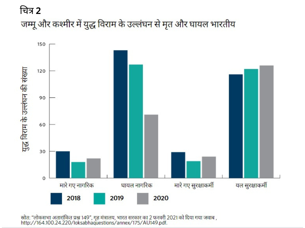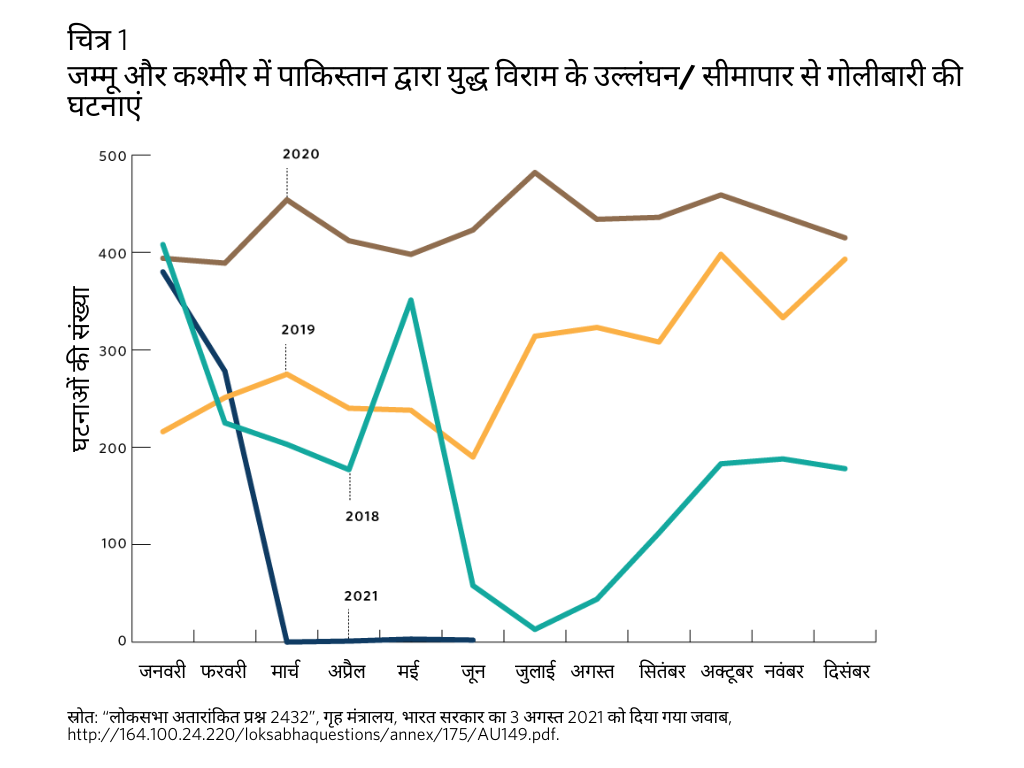 भारत के गृह मंत्रालय के आंकड़ों के मुताबिक, 2018 में पाकिस्तान की तरफ से युद्धविराम के उल्लंघन की 2,140 घटनाएं हुईं, 2019 में 3,479 घटनाएं और 2020 में 5,133 घटनाएं हुईं। 2021 में 30 जून तक सिर्फ 664 ऐसी घटनाएं सामने आईं (देखें चित्र 1)। इन 664 घटनाओं में से लगभग सभी संयुक्त बयान के पहले की हैं। आधिकारिक आंकड़ों के मुताबिक, 25 फरवरी 2021 से 30 जून 2021 तक सिर्फ 6 बार युद्धविराम का उल्लंघन हुआ। साल की दूसरी छमाही और 2022 की शुरुआत में अखबारी रिपोर्टों से पता चलता है कि पिछले सालों के मुकाबले युद्धविराम उल्लंघन में कमी आई है।